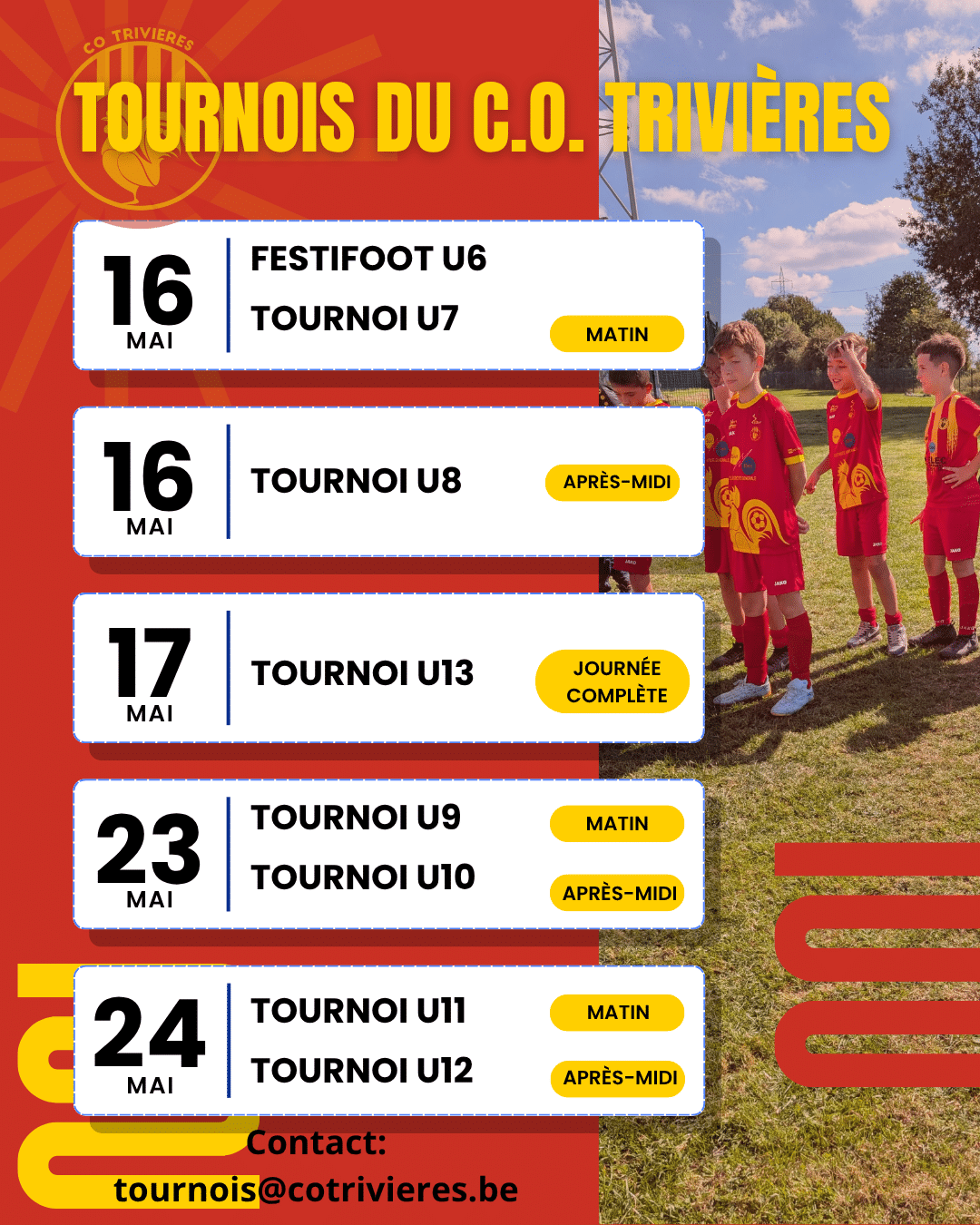 Inscription au TOURNOI Veuillez activer JavaScript dans votre navigateur pour remplir ce formulaire.Prénom - Nom du responsable *PrénomNomE-mail *Numéro de téléphone *Club / Matricule *PrénomNomCouleur(s) équipement *PrénomNom Samedi 16 mai 2026 Equipe U6 - Matin (Festifoot)012Equipe U7 - Matin012Equipe U8 - Après-midi012 Dimanche 17 mai 2026 Equipe U13 - Journée complète012 Samedi 23 mai 2026 Equipe U9 - Matin012Equipe U10 - Après-Midi012 Dimanche 24 mai 2026 Equipe U11 - Matin012Equipe U12 - Après-Midi012Informations supplémentairesEnvoyer